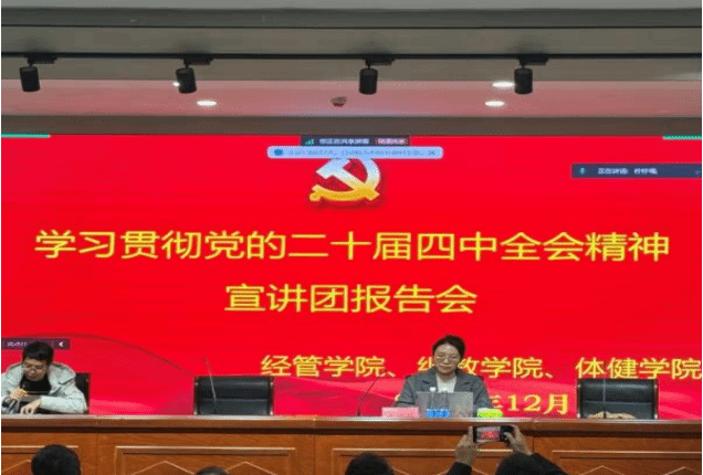 12月12日,为深入学习贯彻党的二十届四中全会精神,学校宣讲团成员、马克思主义学院黄晓晔教授应邀在教31栋104报告厅作专题宣讲报告。经济管理学院、继续教育学院、体育与健康学院各党支部委员会成员参加学习。