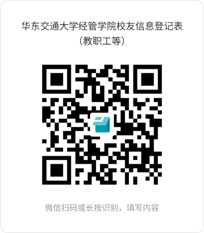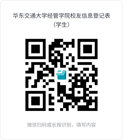 我们诚挚地邀请您扫描下方二维码进行校友信息登记,加入经济管理学院校友会大家庭(此二维码长期有效)。如果您有意为校友会的发展贡献更多力量,欢迎自荐或推荐其他优秀校友加入学院校友会理事会(理事会申请截止时间为10月31日)。您所登记的信息仅用于校友联络、数据统计和校友服务,学院会严格保密,保障您的隐私安全。